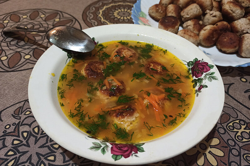 Примерное КБЖУ на 100 грамм: 67 ккал; Б - 5,1 г; Ж - 4,5 г; У - 2 Ингредиенты: - фермерская курица - половина тушки; - небольшой картофель - 3 шт; - небольшая морковь - 1 шт; - куриное яйцо C1 - 1 шт; - лавровый лист - 1 шт; - черный перец по вкусу; - соль по вкусу; - вода для бульона; - растительное масло для жарки. Способ приготовления: Готовим бульон У меня кастрюля емкостью 3,8 л и все ингредиенты рассчитаны именно на такой объем. Кладем курицу, наливаем холодную воду и ставим на огонь. Когда начнет образовываться пена, снимаем ее шумовкой. Если вы пропустили этот момент, не переживайте, бульон можно процедить после приготовления. Я обычно варю его 1,5 ч. Но если у вас цыпленок или совсем молодая птица, время варки можно сократить приблизительно на 30 мин. Варим суп Когда бульон будет готов, вынимаем курицу и оставляем ее остывать. Сам бульон солим и пусть продолжает кипеть на маленьком огне. Чистим и режем картофель. Я его шинкую небольшими кубиками. Морковь натираем на терке. Люб