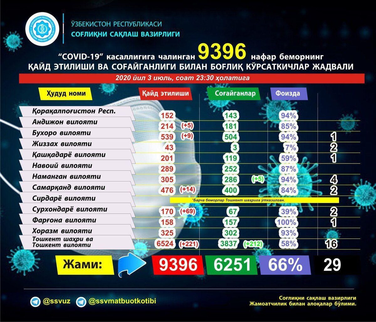 Узбекистан, Ташкент – АН Podrobno.uz. Новые больные коронавирусом за сутки, со 2 по 3 июля, обнаружены в пяти регионах. Вспышка заболевания зафиксирована в Сурхандарьинской области, сообщает корреспондент Podrobno.uz. В Ташкенте и столичной области обнаружен 221 больной, в Сурхандарьинской области –69, Самаркандской области – 14, Андижанской области – 5. "За сутки в стране было зарегистрировано 318 случаев. Из них 273 были обнаружены в карантинных учреждениях, 45 – среди населения (в том числе 37 – в Ташкенте, 5 – в Андижанской области, 3 – в Ташкентской области)", – сообщили в министерстве. За день выздоровело 217 человек (212 – в Ташкенте и 5 – в Наманганской области). В настоящее время 6251 из 9396 пациентов выздоровели, еще 3116 пациентов проходят лечение в медицинских учреждениях. 16 из них находятся в тяжелом состоянии, а 8 – в критическом. При этом 41926 человек находятся под медицинским наблюдением в домашнем карантине и 22438 – в стационарном карантине. Статистика прироста п