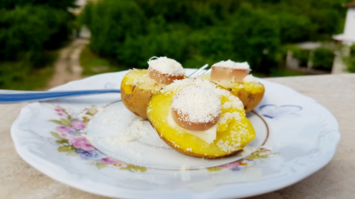 2. Достаем картошку и разрезаем на две половинки. Картошка к этому времени полностью приготовится и будет мягкой.