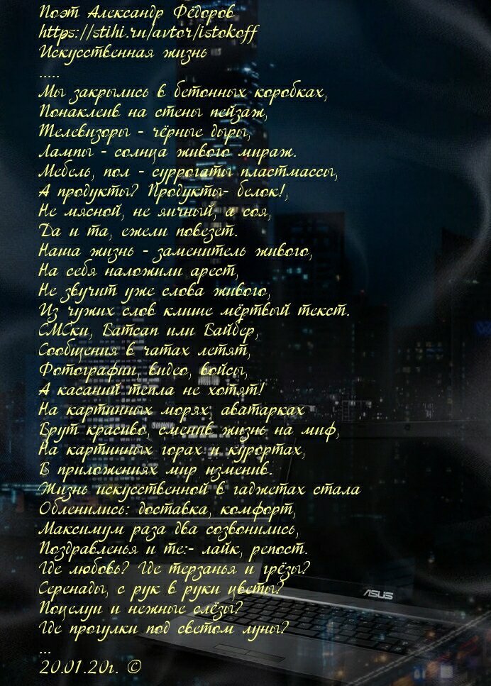 Поэт Александр Фёдоров https://stihi.ru/avtor/istokoff Искусственная жизнь ..... Мы закрылись в бетонных коробках, Понаклеив на стены пейзаж, Телевизоры - чёрные дыры, Лампы - солнца живого мираж. Мебель, пол - суррогаты пластмассы, А продукты? Продукты- белок!, Не мясной, не яичный, а соя, Да и та, ежели повезет. Наша жизнь - заменитель живого, На себя наложили арест, Не звучит уже слова живого, Из чужих слов клише мёртвый текст. СМСки, Ватсап или Вайбер, Сообщения в чатах летят, Фотографии, видео, войсы, А касаний тепла не хотят! На картинных морях, аватарках Врут красиво, сменив жизнь на миф, На картинных горах и курортах, В приложениях мир изменив. Жизнь искусственной в гаджетах стала Обленились: доставка, комфорт, Максимум раза два созвонились, Поздравленья и те:- лайк, репост. Где любовь? Где терзанья и грёзы? Серенады, с рук в руки цветы? Поцелуи и нежные слёзы? Где прогулки под светом луны? ... 20.01.20г. ©