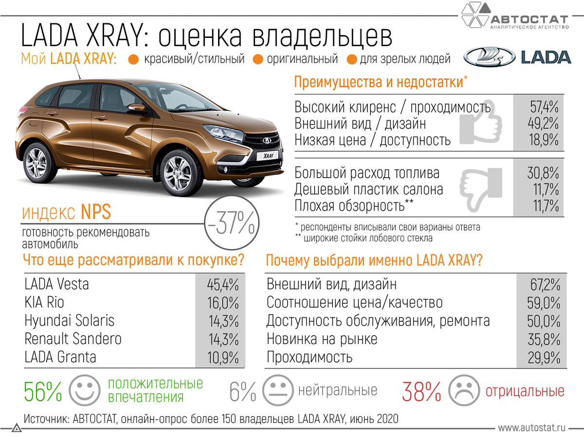 В опросе от агентства «Автостат» приняли участие 150 владельцев Lada XRay. Большинство респондентов ответили, что сделали выбор в сторону XRay благодаря интересному внешнему виду и оригинальному дизайну, оптимальному соотношению «цена-качество» и доступному обслуживанию. Некоторые владельцы остались довольны тем, что модель на рынке относительно новая, а за счет высокого клиренса у нее хорошая проходимость. В целом автомобиль оставил положительные впечатления у 56% владельцев, а отрицательные — у 38%. Рекомендовать ее к покупке готовы 37% владельцев. Главными недостатками Lada XRay назвали большой расход топлива, дешевый пластик в отделке салона и плохую обзорность из-за широких стоек лобового стекла. Lada начала продажи самой дорогой версии XRay в конце апреля. Новинка с механической коробкой и 122-сильным мотором 1,8 л стоит 988 900 рублей. Версия с автоматической трансмиссией и двигателем 1,6 л на 113 л.с. обойдется в 1 048 900 рублей. Кстати, несмотря на слухи, а «АвтоВАЗе» н