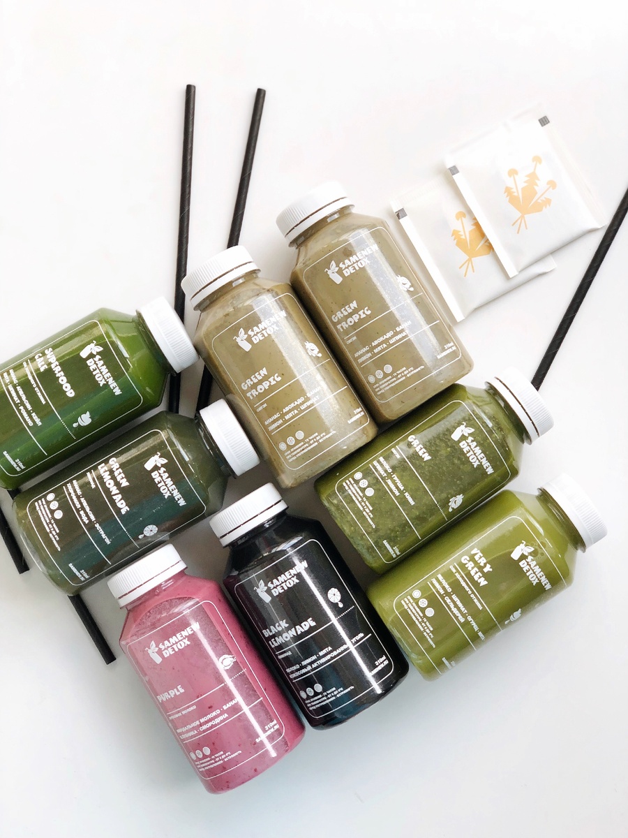 Детокс-набор "CLEAN SKIN" на 1 день входит: 🍏сок холодного отжима "SUPERFOOD KALE" (ананас, апельсин, кейл, мята, шпинат, романо) 1 шт 🍏сок холодного отжима "VERY GREEN" (сельдерей, огурец, шпинат, лимон, мята , яблоко) 1шт. 🍏смузи "GREEN" (лимон, киви, шпинат, яблоко, груша) 1шт 🍏смузи "GREEN TROPIC" (ананас, Авокадо, банан, мята, лимон) 2 шт 🍏лимонад "Black Lemonade" (мята, активированный кокосовый уголь, лимон, яблоко) 1шт 🍏лимонад "Green Lemonade" 1шт. (эстрагон, хлорофилл, ананас, апельсин, вода). 🍏смузи "PURPLE " 1шт. (миндальное молоко, банан, смородина, клубника) травяной детокс-чай 2шт.