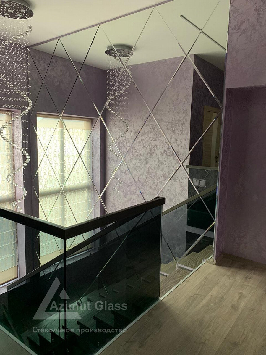 Проект по созданию и монтажу зеркального панно в частном доме, расположенном в поселке Парголово, мы реализовали за 20 рабочих дней. Изящная и стильная композиция из зеркальных плиток ромбовидной формы украсила стену, расположенную в фойе жилого дома. Для изготовления элементов панно использовалось зеркало толщиной 4 мм, с фацетом 15 мм. Благодаря использованию фацета композиция, составленная из панелей одинакового размера, получилась стильной и объемной. В сочетании с оригинальной люстрой с декором, напоминающим капельки и струи дождя, ниспадающие с потолка, и стеклянным ограждением лестницы, панно выгодно подчеркнуло высоту потолков помещения, придало окружающему пространству глубину, свободу и легкость. Использование зеркальной композиции в интерьере коридора сделало его более светлым и просторным за счет отражения окна, расположенного напротив конструкции лестницы. Панно отлично вписалось в общую отделку в насыщенных лиловых тонах, удачно оттенив их глубину и выразительную фактур