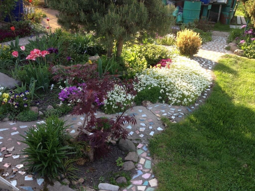 Я так привыкла к этому клёну, что порой мне кажется будто бы он все время рос на этом самом месте. Но это не так. Сначала я здесь сажала розу плетистую, которую привязывала к столбу, который был вкопан посередине этой крошечной круглой клумбы. Клен с малиновыми резными листьями у меня появился летом 2008 года. Я его купила уже с раскрытыми листьями в горшочке за 1900 рублей. Сразу поясню, что теперь мне такие затраты не по карману:)) Но был такой период, когда я неплохо зарабатывала. И старалась купить не новую сумочку или туфли, а именно красивый цветок. Но это я так сказала, к слову. Чтобы меня не стали упрекать в слишком больших тратах на растения:)) Но я благодарна тому времени (времени под солнцем), потому что у меня с тех прекрасных пор сохранилось большое количество редких и красивых цветов. Итак. купила в 2008 году, но первые два фото - это уже 2015 год. Вы меня спросите :"Автор, почему Вы сразу перескочили с момента покупки на 7 лет вперед?". Отвечу. Да посмотрите сами на э