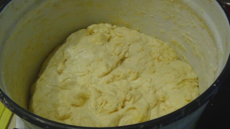 Полученную массу посыпают мукой, накрывают тканью, оставляют еще на 1,5 часа.