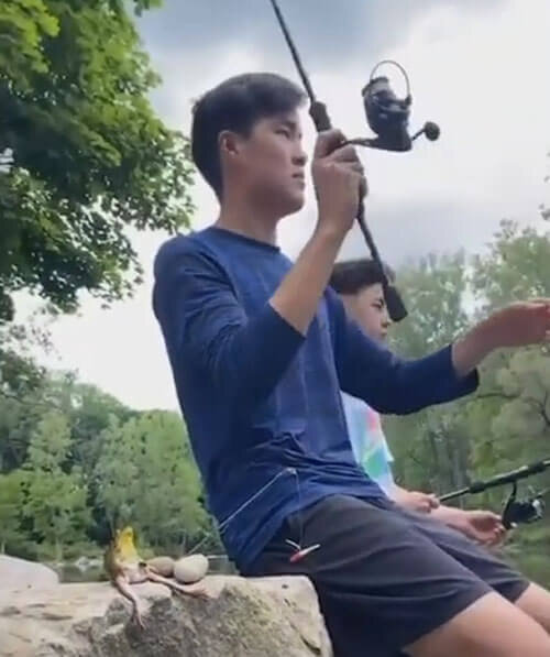 Домашняя лягушка по кличке Хьюберт всегда и везде готова сопровождать своего хозяина и его друзей. Забавный видеоролик, снятый Доусоном Яношитой из Онтарио (Канада), показывает, как Хьюберт не отказался пойти с приятелями на рыбалку. Невозмутимое создание, восседающее с крошечной удочкой на камне, очень понравилось зрителям, так что забавные кадры стали популярными в интернете