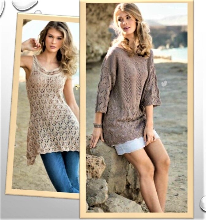 Вот и наступила середина лета. Уже можно выезжать в курортные зоны на российском побережье, что многие уже и сделали, ну, а кто остался дома, тоже надеется на теплое лето. Все согласятся со мной, что в жару и не только, телу позволяют "дышать" изделия из хлопка и льна. Сегодняшний обзор посвящен вязанной одежде из льняной и хлопковой пряжи. Температура кожи ,человека носящего льняную одежду в жару, будет на 3-4 градуса ниже , чем у человека носящего хлопок или шёлк. У такой одежды много преимуществ: Одежда из льняной пряжи прослужит не один сезон. Все описания из открытых источников интернета. 1. Коричневая туника. Эффектная туника с сочетанием разных ажурных структур, связана из отборной льняной пряжи. 2. Ажурный топ. Топ для жарких летних дней: скошенная линия и низа и связанная крючком линия горловины придают модели оригинальность. 3. Кардиган связанный поперёк. Связанный поперёк кардиган с вплетённой бахромой- идеально защитит Вас от свежего бриза. 4 и 5. Жакет и пуловер с а
