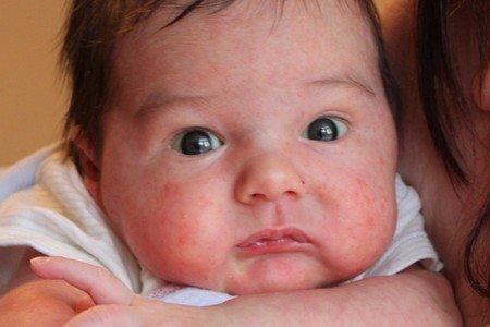 Подобная реакция возникает под действием на кожу младенца высоких температур, приводящих к повышенной потливости определенных участков тела.