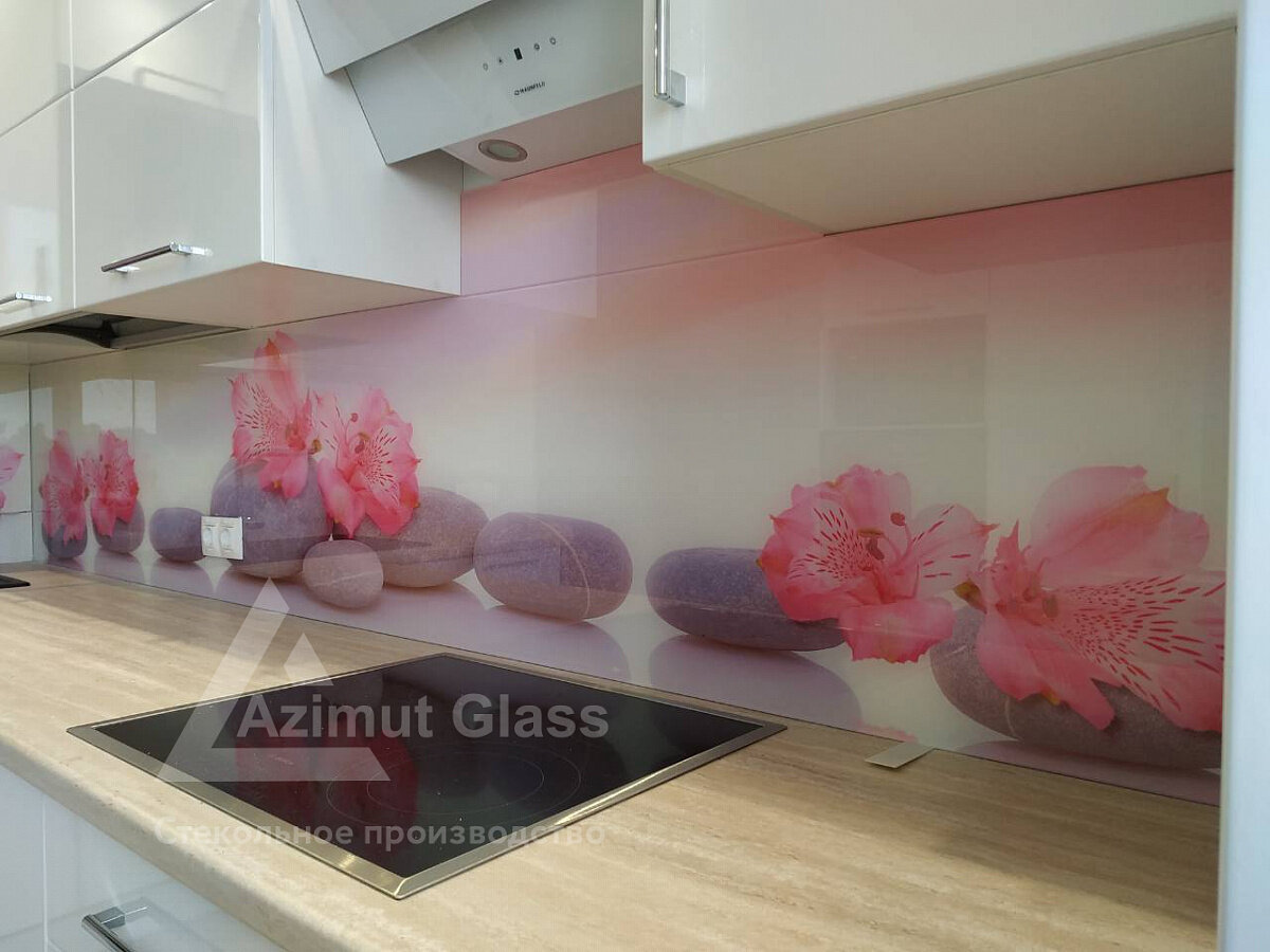 Яркий, стильный и эффектный кухонный фартук из стекла с фотопечатью мы сделали по заказу клиента по адресу: г. Тосно, ул. Максима Горького, 25. Для его изготовления использовалось закаленное стекло толщиной 6 мм, обработанное по технологии оптивайт, обеспечивающей абсолютное удаление посторонних оттенков и сверхточную цветопередачу фотопечати. В качестве принта, украшающего поверхность скинали, по желанию заказчика, мы использовали изображение нежных розовых цветов, напоминающих экзотических птиц, распахнувших крылья, в окружении округлых морских камней теплого серого оттенка на светло-розовом фоне с легким градиентом в светлую сторону. Нанесение изображения на поверхность стекла производилось методом обратной фотопечати. Дополнительно мы изготовили прямоугольный элемент в тон изделия под вытяжку. В сочетании с поверхностью рабочего стола в тон светлой древесины и кремово-белым цветом кухонной мебели нам удалось достичь ощущения гармонии, чистоты и комфорта, создав на кухне уютный у