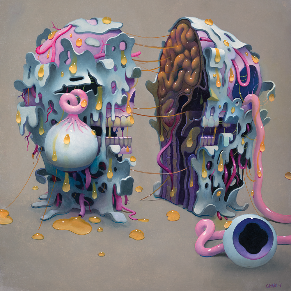Чарли Иммер Мэриленд, США Скелеты конфетного цвета и клоунские существа с широко раскрытыми глазами заполняют восхитительно гротескные картины Чарли Иммера, он ярко изображает то, что лежит под кожей. Получивший образование в Западном Мэриленде, где он в настоящее время живет и работает, Иммер получил степень бакалавра искусств в области иллюстрации в Школе дизайна Род-Айленда в 2008 году. Хотя первоначально он был привлечен к коммерческой иллюстрации, Иммер вскоре нашел выход для своих счастливо-жутких творений в мире изобразительного искусства. Он проводил персональные выставки в Нью-Йорке, Сиэтле и Лос-Анджелесе, и его работы были представлены на многочисленных групповых выставках в США и Европе, в том числе в Риме Suggestivism (2013). Иммер опирается на целый ряд влияний, включая фильмы ужасов, мультфильмы, видеоигры и книги по анатомии, создавая сочные, расчлененные фигуры и остро-кровавые сцены, которые одновременно и юмористичны, и тревожны. Как объясняет художник: Выглядит