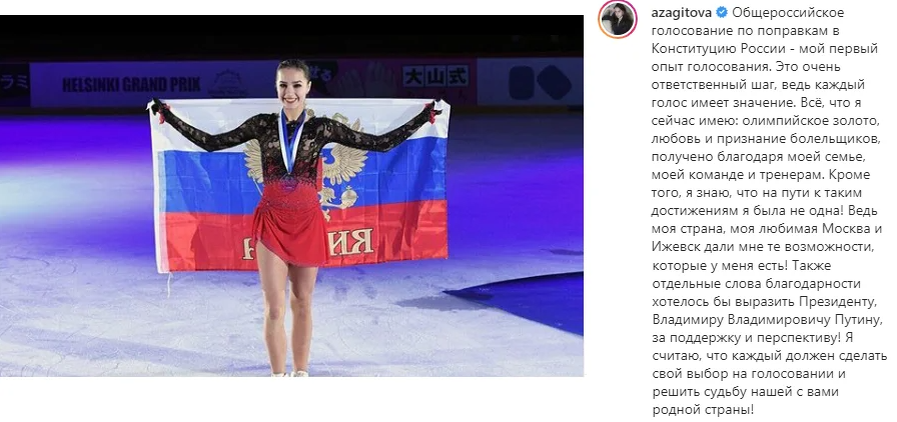 Несколько дней назад, накануне окончания голосования за поправки в Конституцию, олимпийская чемпионка по фигурному катанию Алина Загитова выложила пост, в котором призвала граждан России сделать свой выбор и поблагодарила Президента РФ Владимира Путина за поддержку. Пользователей сети возмутил поступок спортсменки. Многие упрекнули Алину в том, что некогда скромная чемпионка стала очень далека от народа. А некоторые подписчики посчитали, что Алина на этом посте хорошо заработала. "Сколько тебе заплатили, Алина?" - спрашивали на сайте спортс.ру, ведь комментарии к посту в Инстаграме Загитова предусмотрительно закрыла. По нашим данным, такой пост может стоить больше 500 тысяч рублей. Алина Загитова давно известна своей страстью к дорогим вещам, поэтому резонно рассудив, что на такую сумму можно хорошо пошопиться в ГУМе, фигуристка могла с чистой совестью принять непристойное предложение. С этой версией согласны и коллеги спортсменки.