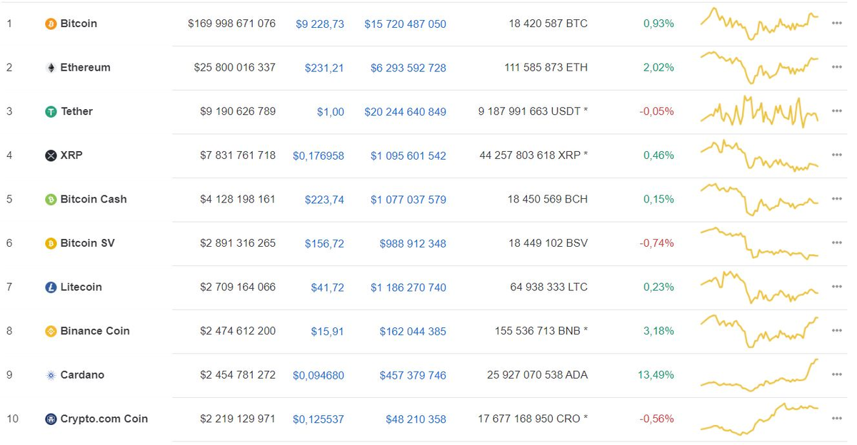 Четверг начался для большинства криптовалют из топ-10 рейтинга капитализации ресурса CoinMarketCap с позитивного движения. По состоянию на 07:45 (МСК) bitcoin торгуется по $9228. Суточный рост криптовалюты составил 0,93%. Лучший результат зафиксирован у Cardano. За 24 часа актив подорожал на 13,49%. Новый участник рейтинга – Crypto.com Coin – продолжает закреплять за собой позиции в топ-10. На момент написания новости, криптовалюта остановилась на 10 строчке.