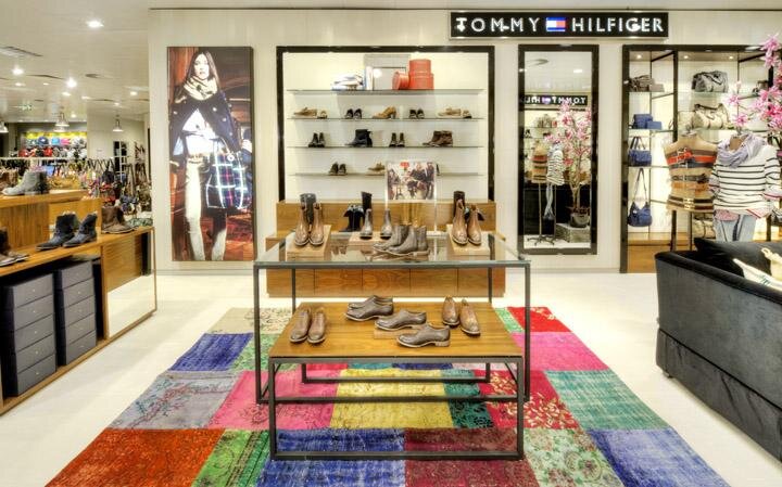 Женские и мужские ботинки Tommy Hilfiger, эспадрильи и туфли стали узнаваемыми благодаря лейблу в красно-синих цветах. Он стал визитной карточкой бренда: прямоугольники – белый слева и красный справа между двумя черными полосками.
