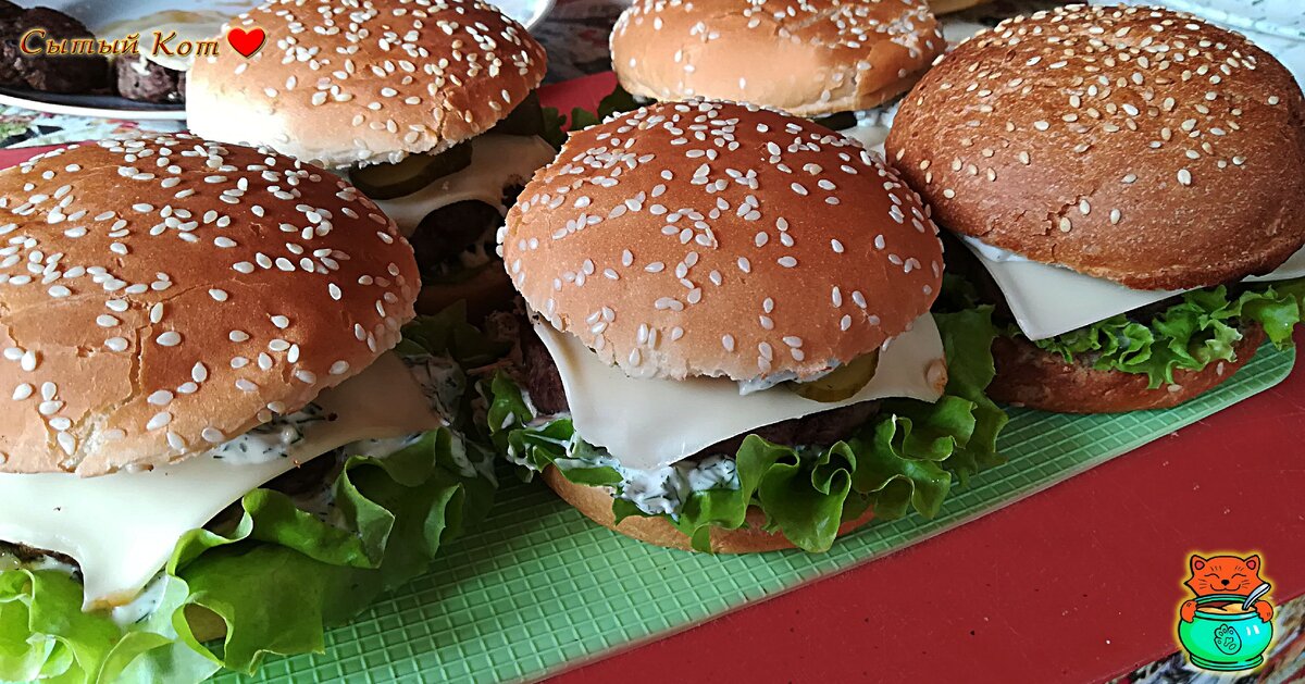 💗 Собираем бургер. На нижнюю часть булочки выложить листья салата, соус, котлету с сыром, тонкий кружок помидора, тонкие кружки огурцов, соус и верхнюю часть булочки.