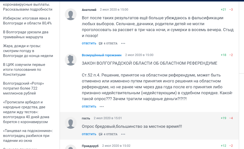Как и предполагали большинство общественников Волгограда, при проведении опроса о переходе Волгоградской области на МСК, мы столкнулись с фактом подтасовок и лживого подсчёта голосов! Волгоград два года назад к радости большинства жителей начал жить по своему местному времени. В результате у людей появился дополнительный световой час, который можно было использовать для прогулок с детьми и животными, обработкой дачных участков и огородов. Дело в том, когда мы живём по МСК, в Волгограде темнеет в 16:30 зимой и 20:00 летом. Другими словами, мы живём в постоянной темноте, что, естественно, ведёт к недостатку естественного витамина D и сопутствующим заболеваниям, а также хандре и усталости! Однако чиновникам и депутатам абсолютно наплевать на то, что большинству жителей Волгограда необходимо именно местное время, так как им самим в силу профессиональной деятельности удобнее работать со столицей впо МСК! Поэтому, одновременно с голосованием за поправки в Конституцию, они провели фиктивный