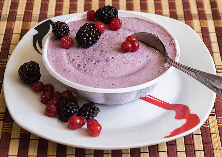 - Желатин кладем в холодную воду и ждём, пока он набухнет, потом ставим его в микроволновку на 25 секунд. Тем временем в блендере мы смешиваем ягоды и сливки.