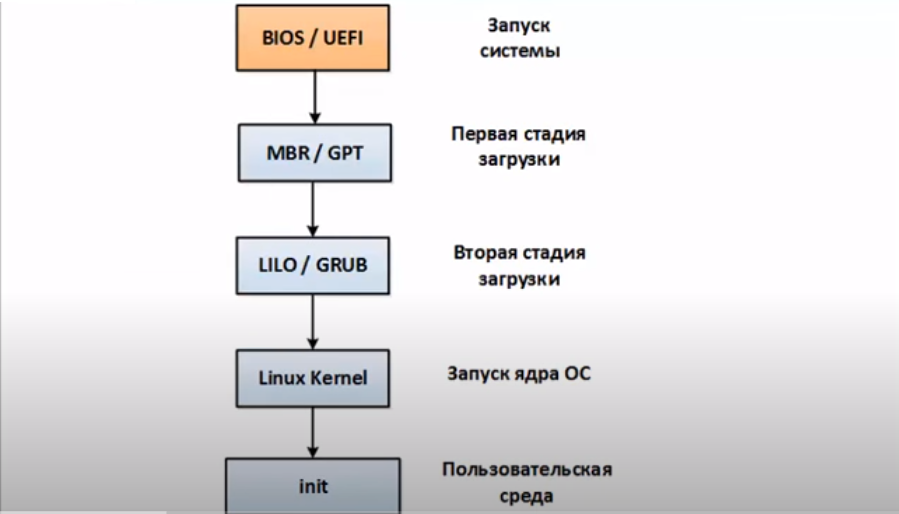 В любом случае, если идет речь о Linux у нас есть первая стадия с небольшой частью кода, которая загружает у нас загрузчик. Загрузчик знает где лежит ядро операционной системы, загружает ядро, загружает initial run disk, там находятся необходимые файлы и модули для загрузки ядра. Далее уже ядро берет процесс управления на себя. Происходит инициализация устройств, конфигурирование процессов памяти и .т.д. После всех этих процессов ядро запускает процесс init.