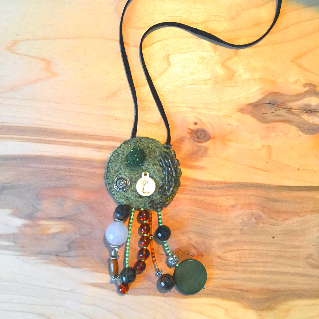 Иногда из ничего буквально удается создать нечто. Вдохновение пришло внезапно. Сюжет подвески в том, что человек (он в центре) является проводником энергии Солнца, Луны, других звёзд и планет Вселенной. Он - часть мира, его руки подняты вверх, что символично принятием, открытостью и смирением. Материалы использовала все, что были под руками, лежали без всякой пользы, как остатки былых проектов. Все пошло в ход: бусины, бисер, нашивки, остатки пряжи, шерсти, кожи и даже украшения от старой люстры. Основу связала крючком по кругу, - это и полным неумехам под силу. Теперь вот думаю: «можно такое в мир выгуливать?» или слишком бохо-бохо? Пока не по сезону, немного “махровенько” для лета, поэтому убрала в шкаф. А вообще классно получилось, с водолазкой смотрится стильно и уютно, по-женски.