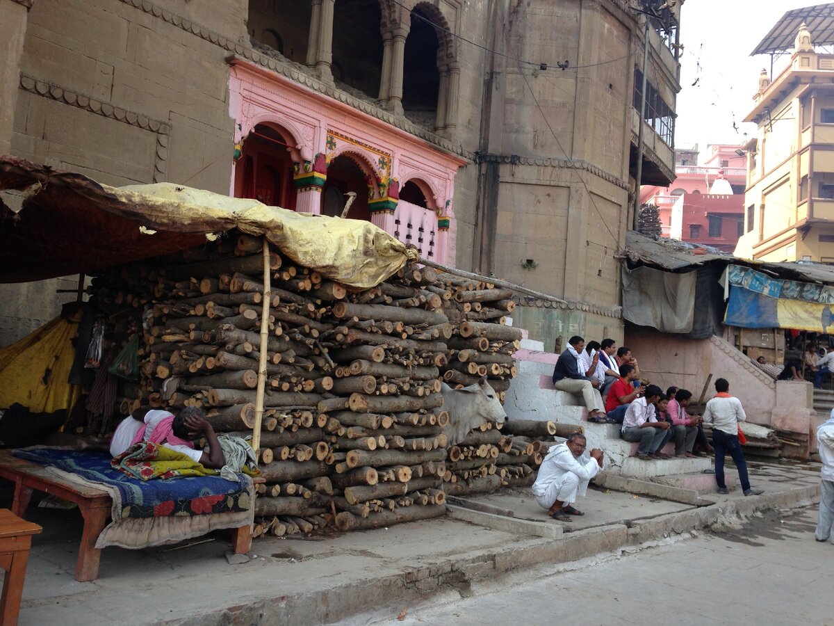 Дорога из геста на Гангу есть только одна - через Маникарнику. Мимо мрачных штабелей кривых, но по-индийски аккуратно сложенных дров, мимо огромных старинных весов для взвешивания дров, мимо догорающих с вечера погребальных костров, через кучи коровьих лепёшек и прочих нечистот. Для кремации нужно определенное количество дров. Если дров не хватит, то всё что не догорит сбрасывают в Гангу. В священных водах Ганги много всякого разного. И пепел погребальных костров, и проплывающие по течению трупы собак, а зачастую и людей. В индуизме есть несколько категорий людей, которых запрещено кремировать. Таких вывозят на середину Ганги и сбрасывают в воду с камнем на ноге. Иногда плохо завязанная верёвка развязывается и тело всплывает.