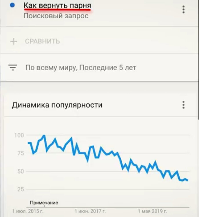 Если ради интереса зайти в аналитику Google Trends и узнать как изменились запросы женщин за последние 16 лет и сейчас мы узнаем, что на самом деле интересно современным девушкам, но сразу разочаровывать тебя не стану, лучше обо всем по порядку. Поехали! 1. Женщин все меньше волнует вопрос о восстановлении отношений по своей инициативе, но если сравнить это с количеством разводов и расставаний, которые активно летят вверх, можно уже делать выводы. За последние 5 лет, очевидно, что пользователей интернета стало больше, а запросов о восстановлении отношений-меньше, тоесть женщин больше не интересует роль дипломата в отношениях. Но почему это не интересно женщинам? Потому что она ушла сама и возвращать ей нечего? Значит расставания и разводы, все чаще происходят именно по женской инициативе, но почему же женщины так резко активно стали инициировать расставания сами? Представь себе огромный супермаркет, где выбор продуктов неограничен и можно взять себе, что угодно на любой вкус, а взять