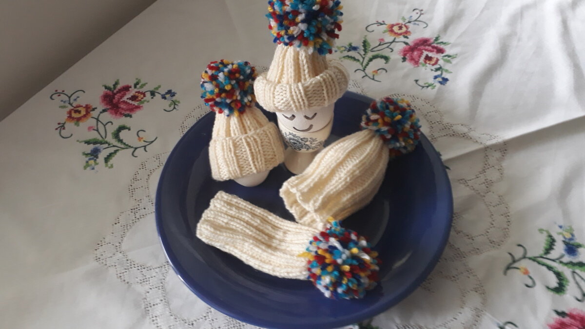 Яйца сварены, уже остывают, а муж и дети не спешат к столу? В этих шапочках яйца так быстро не остынут, а накрытый стол будет выглядеть гораздо красивее. Нам понадобится всего лишь немного ниток (подойдут остатки любых шерстяных ниток). И даже если нет вязальных спиц - не беда, можно использовать деревянные палочки для шашлыка. Связать такое может даже абсолютный новичок.