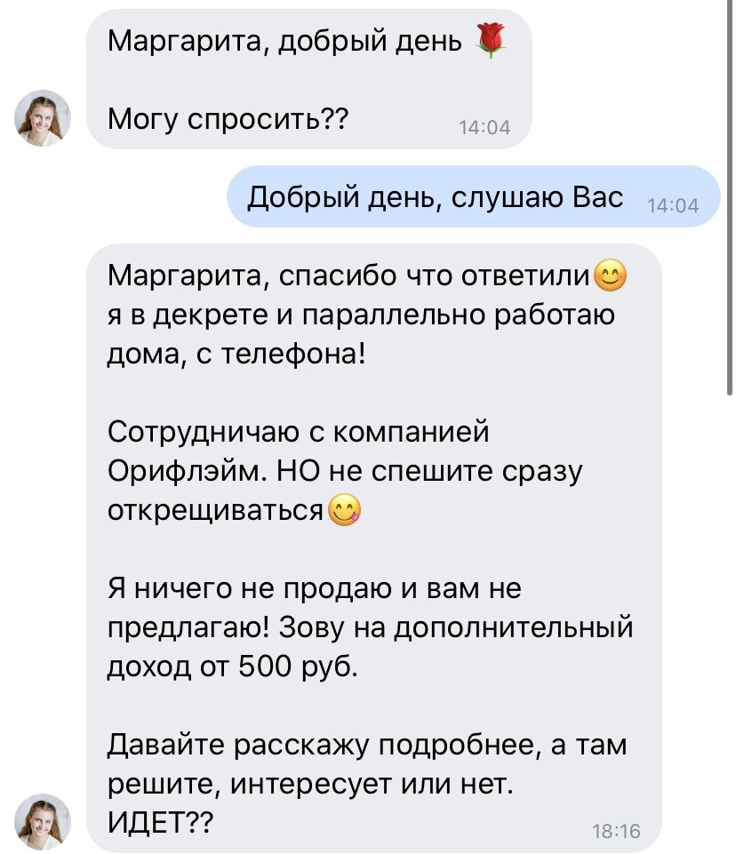 Сижу я, никого не трогаю, выполняю задания по 0.1$ на Толоке, как вдруг приходит сообщение. К слову, менеджеры компании Орифлейм часто стучаться ко мне в личные сообщения в контакте и, в 90% случаев, остаются без ответа, либо получают сухое «спасибо, не интересует». Но тут девушка явно скреативила :)