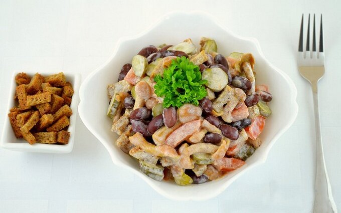 Приготовление салатов из фасоли и сухариков — очень быстрый и простой процесс, для которого не потребуется больших знаний и умений. Главное в этом деле — иметь хорошую фантазию, потому что салаты всегда можно дополнять другими продуктами по собственному желанию. Важно, чтобы они отлично сочетались между собой. Итак, как же сделать вкусный салат из фасоли и сухариков? Все очень просто, в этом помогут следующие рецепты. Простой салат с фасолью и сухариками ИНГРЕДИЕНТЫ Время приготовления: 20 минут Калорийность на 100 грамм: 115 Ккал Как приготовить: Фасоль следует предварительно отварить. Для того чтобы она быстро приготовилась ее нужно вымачивать в воде 4-5 часов; После этого вымоченную фасоль отвариваем до готовности, она должна стать мягкой; С лука снимаем шелуху и нарезаем его тонкой соломкой; Морковь чистим от грязи, шкурки, ополаскиваем и протираем в крупную стружку; На плиту ставим сковородку с маслом, раскаляем до кипения и закидываем туда лучок. Обжариваем пару минут; Затем вык