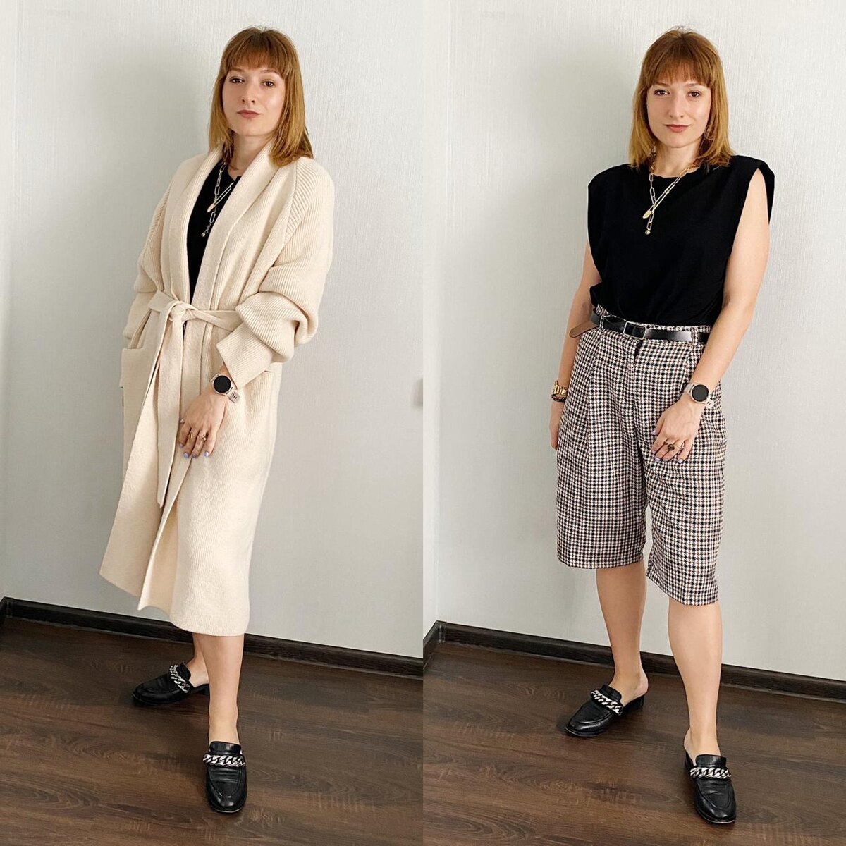 Всем привет! На связи снова персональный стилист Анна Бельская, специалист по грамотному шоппингу на Алиэкспресс. Скучали по новым лукам? Я – однозначно да! Сегодня погодка у нас прохладная, поэтому я позволила себе надеть крутой молочный кардиган отменного качества из натуральной шерсти, который я заказывала на али во время карантина. По правде говоря, не думала, что смогу его поносить в этом сезоне – но, удалось! Потрясающе стильный, в меру теплый, думаю, что его можно будет и осенью поносить в качестве верхней одежды. У продавца представлен в четырех цветах.. Все цвета очень благородные. Данный кардиган отлично будет смотреться в минималистичных комплектах. Размер единый, но он подойдет вплоть до 50-52 размера. Цена 3300 руб . Ссылка Перейдем к основному комплекту, он получился у меня достаточно трендовым. Снизу я надела бермуды в гусиную лапку в стиле Zara. К сожалению, ссылка на них более неактивна, и приобрести их на али больше невозможно, их сняли с производства. Чего нельзя