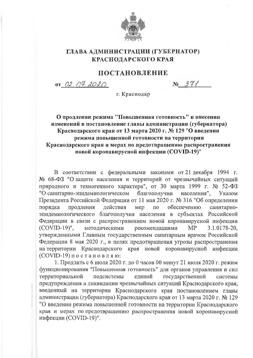 Постановление главы администрации (губернатора) Краснодарского края от 02.07.2020 № 371 "О продлении режима "Повышенная готовность" и внесении изменений в постановление главы администрации (губернатора) Краснодарского края от 13 марта 2020 г. № 129 "О введении режима повышенной готовности на территории Краснодарского края и мерах по предотвращению распространения новой коронавирусной инфекции (COVID-19)"
