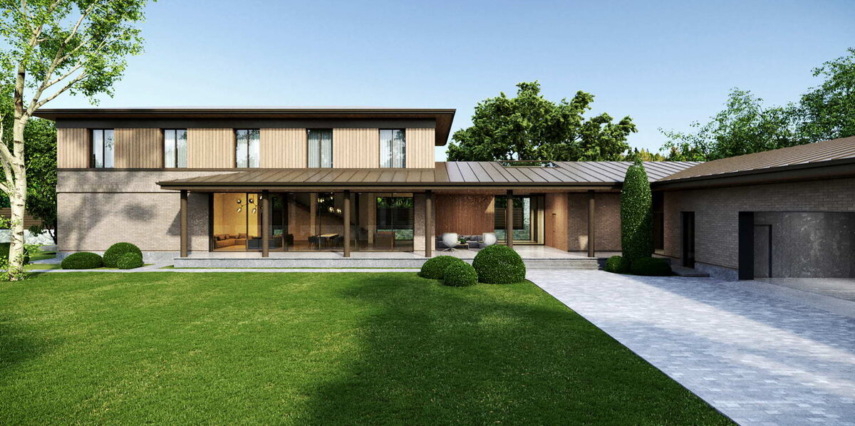 Легкая, уютная и при этом функциональная загородная вилла запроектирована на участке 28 соток, защищённом от шума и суеты мегаполиса мощным лесным массивом. Два дома, основной (807 м2) и гостевой (142 м2), образуют внутренний двор, ориентированный на юг с видом на лес.