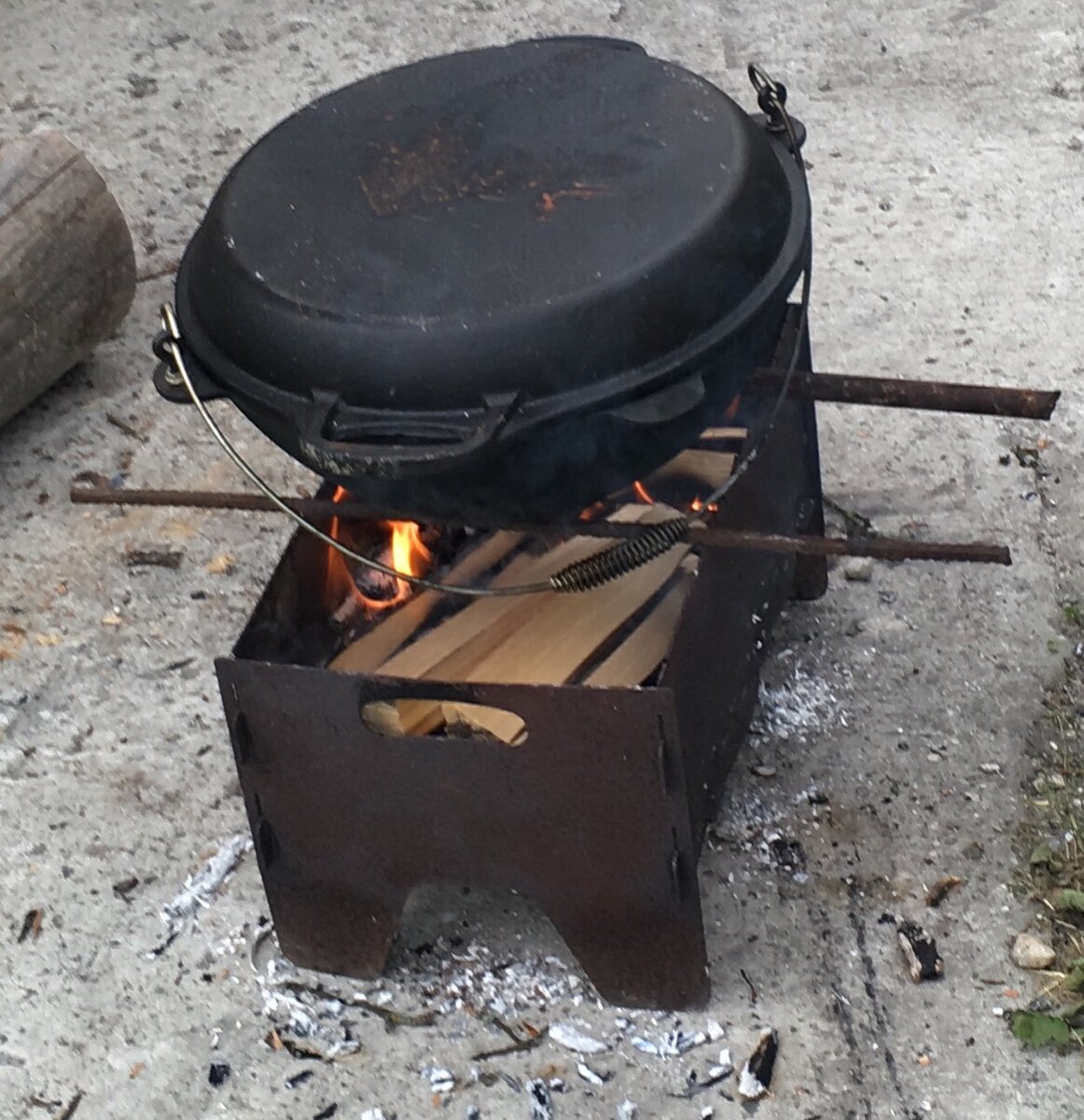 Приветствую тебя читатель! Во время своего отпуска решил поэкспериментировать в приготовлению блюд на костре. В этот раз я решил сделать довольно необычное блюдо, рецепт которого мне рассказал папа. Берётся лещь (рыба), из неё вытаскают все внутренности, вкусу изнутри солим и перчим. Я занимался ранее подобными вещами, поэтому этот этап довольно быстро завершил. Главный нюанс в разделывание заключается в том, что не нужно чистить рыбу от чешуи. Далее следует приготовить казан. Он представляет из себя довольно большой таз с чугунной крышкой. Очень тяжёлая вещь, по ощущениям килограмм 30. Мы его моем, высушиваем, и на дно выкладываем тонким слоем обычные древесные опилки. В моем случае я использовал сосновые, от них на мой взгляд более приятный запах. Сверху прям на опилки ставим подставку, на который и будет лежать наша рыба. Под леща подкладываем алюминиевый поднос, предварительно сделав в нем маленькие отверстия. Такой поднос модно купить в любом продуктовом магазине. Пол дела сдела