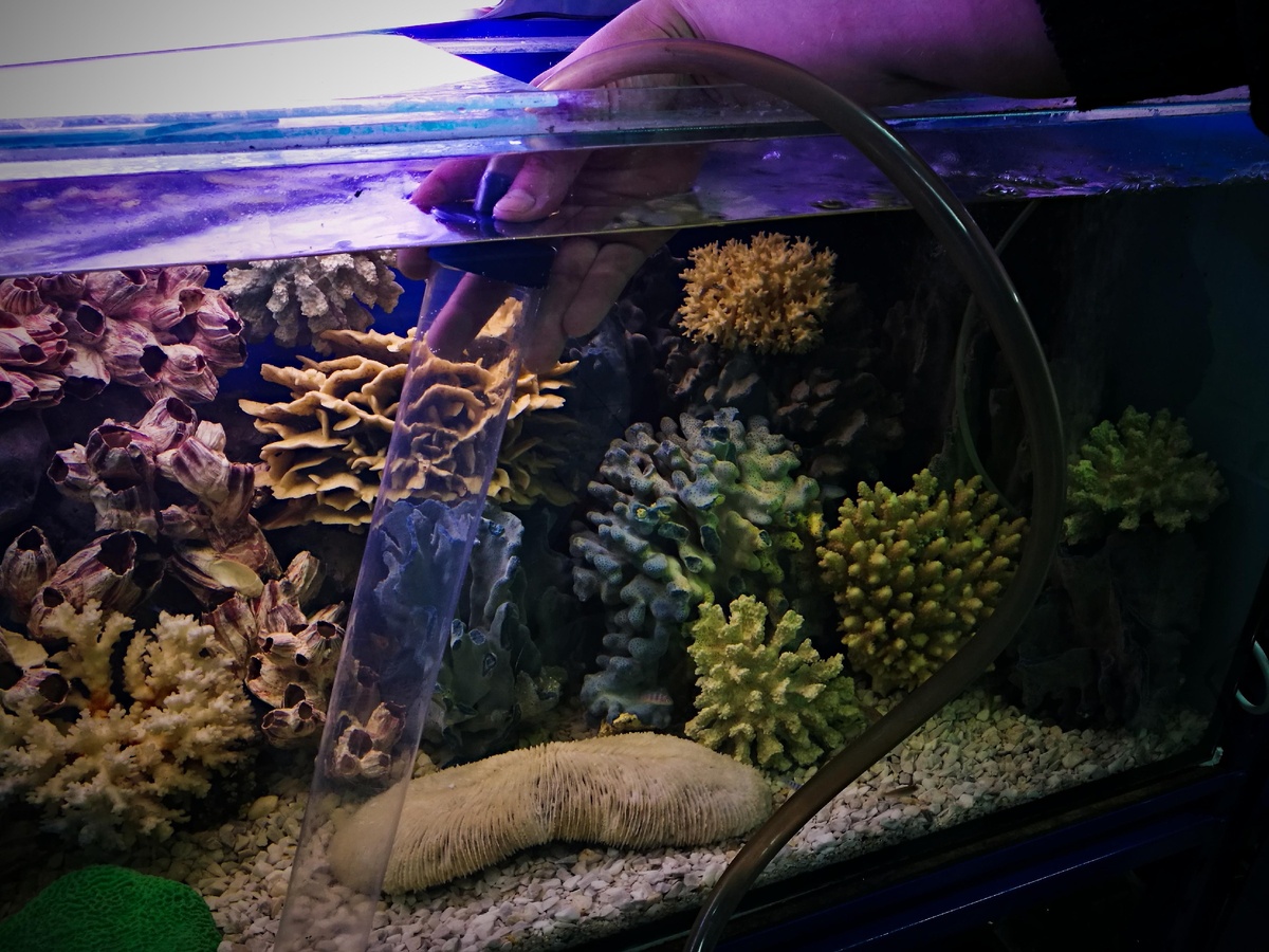 В независимости от объема аквариума перед началом уборки необходимо отключить оборудование и слить часть воды из аквариума ~ 10%. Это позволит не расплюхивать воду на пол при интенсивных манипуляциях руками.