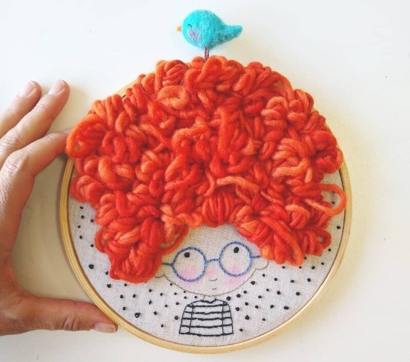 Мастерица сочетает в некоторых изделиях сразу два вида рукоделия: валяние и вышивание. И эта работа не стала исключением. Маленькая девчонка с яркими волосами, заплетенными в косички, держит на руках валяного кота и смотрит на голубую птицу на ее макушке. Вышивка очень милая и забавная.