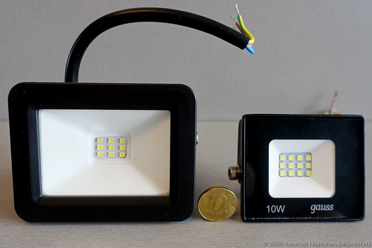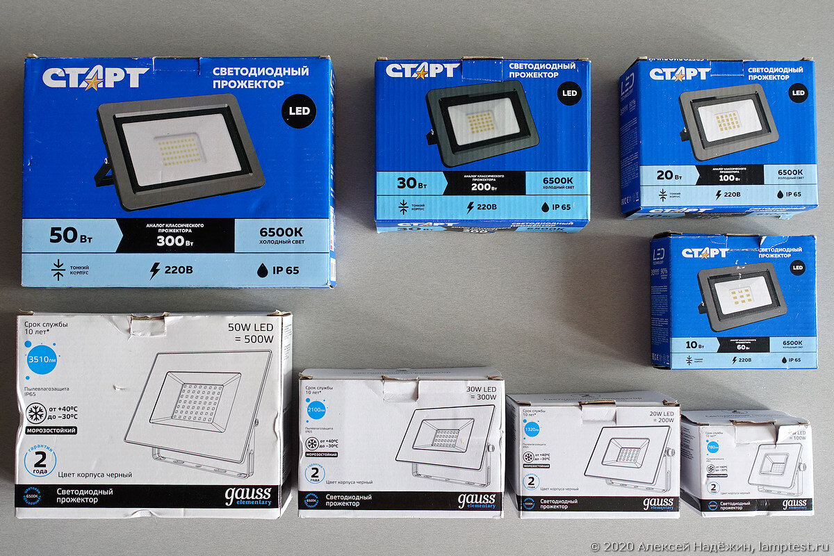 В тесте приняли участие четыре прожектора Старт (10, 20, 30 и 50 Вт) и четыре прожектора Gauss дешёвой серии Elementary (также 10, 20, 30 и 50 Вт.).