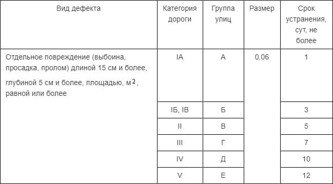 Получается если повреждение дорожного покрытия будет с длинной 15см и более, или глубиной 5см и более и площадью более 0,06 кв.м, то предельный срок устранения составляет не более 12 суток.