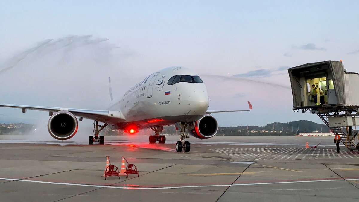 26 июля 2020 года Международный аэропорт Сочи впервые в своей истории встретил Airbus A350-900. Рейс авиакомпании "Аэрофлот" прибыл из Москвы. Приветствовали великана водяной аркой. В течение сезона этот великан будет частным гостем в аэропорту Сочи, осуществляя ежедневные полеты из столицы на курорт. #аэропорт сочи #Airbus A350-900 #первый рейс #аэрофлот