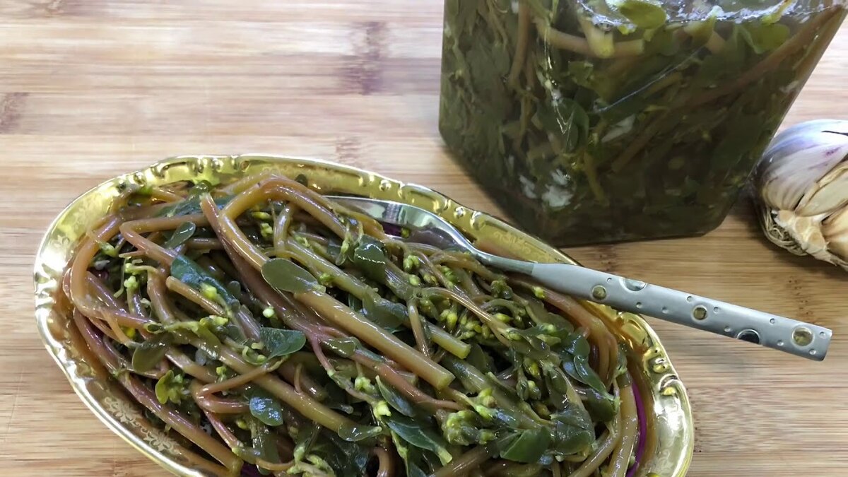 Портулак - это сорняк, который наверняка растет практически в каждом огороде и многие пытаются избавится от него годами. Но мало кто знает, что он очень полезный и вкусный. Портулак можно есть сырым, добавлять в салаты, жарить, тушить и мариновать. Я мариную портулак на зиму. На вкус, как маринованные огурчики. Из этих ингредиентов получается 1 литровая баночка. Ингредиенты: Приготовление: Промываем портулак несколько раз от песка и земли ( иначе потом будет хрустеть на зубах). Складываем портулак в кастрюлю, заливаем водой и отвариваем после закипания 5 минут. Отбрасываем вареный портулак на дуршлаг и промываем холодной водой. Берем банку 1 л, стерилизуем под паром. В банку кладём лист хрена, лавровый лист, перец горошком, зубчики чеснока и укроп. Туда же отправляем портулак и слегка утрамбовываем. Делаем маринад : В кастрюлю с водой отправляем соль и сахар. Как закипит, выключаем и добавляем уксус. Заливаем маринад в банку, закрываем, переворачиваем и укутываем полотенцем. Оставл