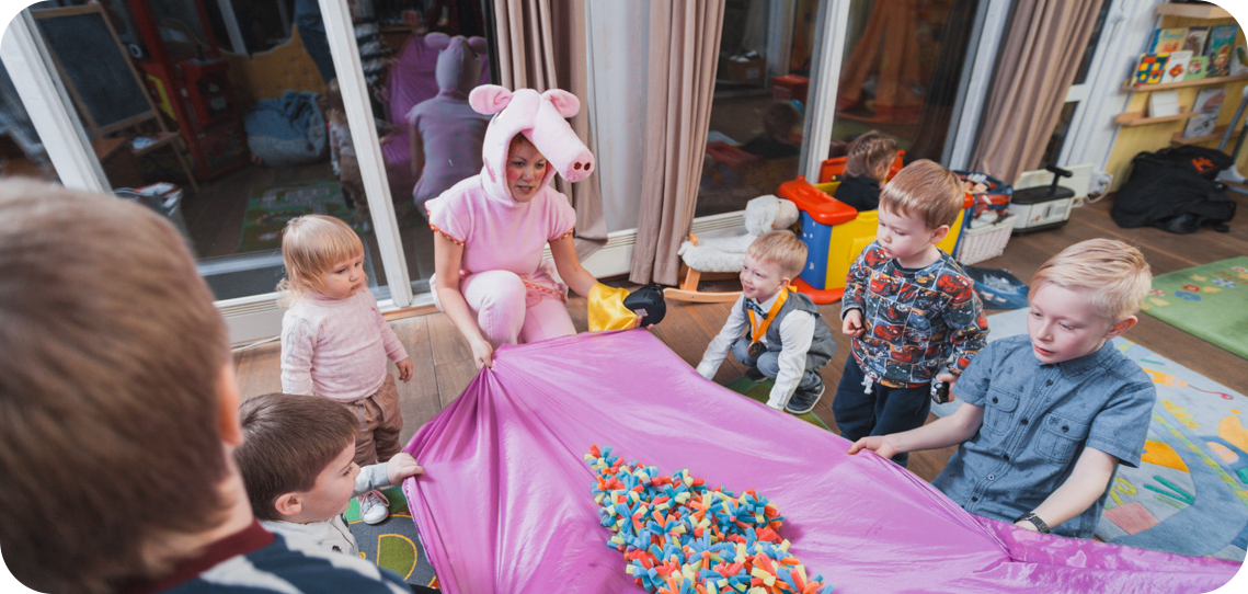 Здравствуйте, детишки! Вы меня узнали? Да, да я Свинка Пеппа! (Хрюкает) Я сегодня такая весёлая и счастливая, потому что мне повезло попасть к вам на праздник. Я так люблю праздники! А особенно дни рождения! Покажите-ка мне нашу(-его) именинницу(-ка) !