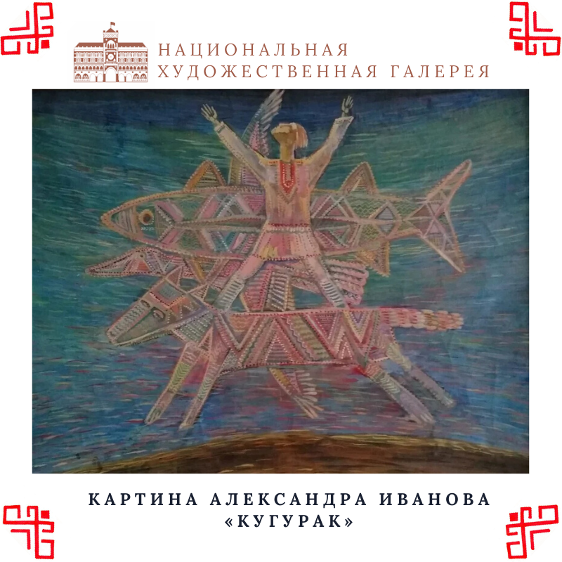 Одна из таких работ ««Кугурак». Олицетворение единства человеческого и природного мира. Животные выступают не только в роли первопредков, но и олицетворяют стихии: волк – землю, птица – небо, рыба – воду. Вместе с человеком они образуют единую символическую ось Вселенной.