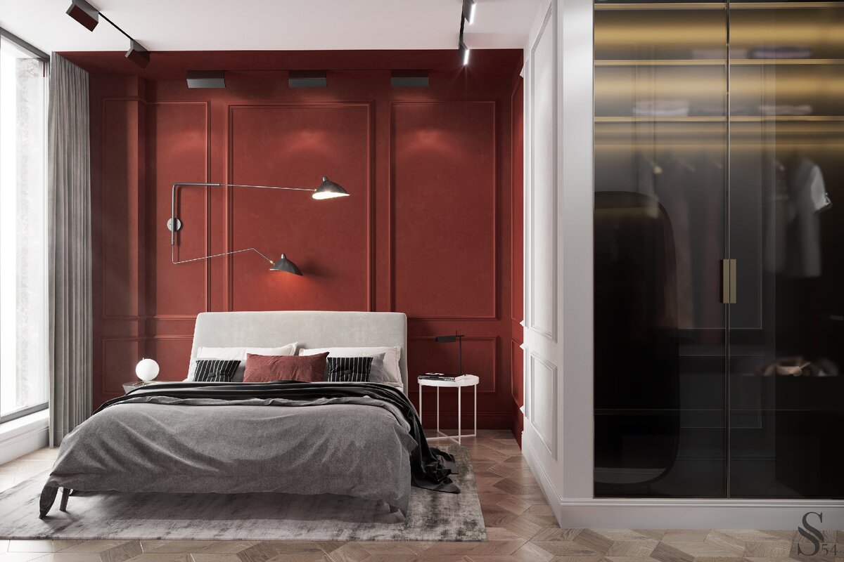 Яркий акцент в спальне - красный цвет, в который окрашена стена и часть потолка. Удобное расположение гардеробной позволить сократить время а сборы по утрам. А минимальное количество декора и аксессуаров позволят наслаждаться отдыхом каждый день.
