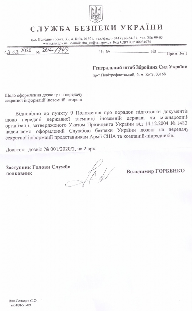 В сопроводительном письме в Генштаб ВСУ замначальника СБУ полковник Владимир Горбенко пояснил, что речь идет именно о «разрешении на передачу секретной информации представителям Армии США и компаний-подрядчиков». Допуск американским представителям оформлен СБУ сроком до 30 декабря 2021 г. на основании соглашения между правительствами Украины и США об охране секретной информации в сфере обороны.