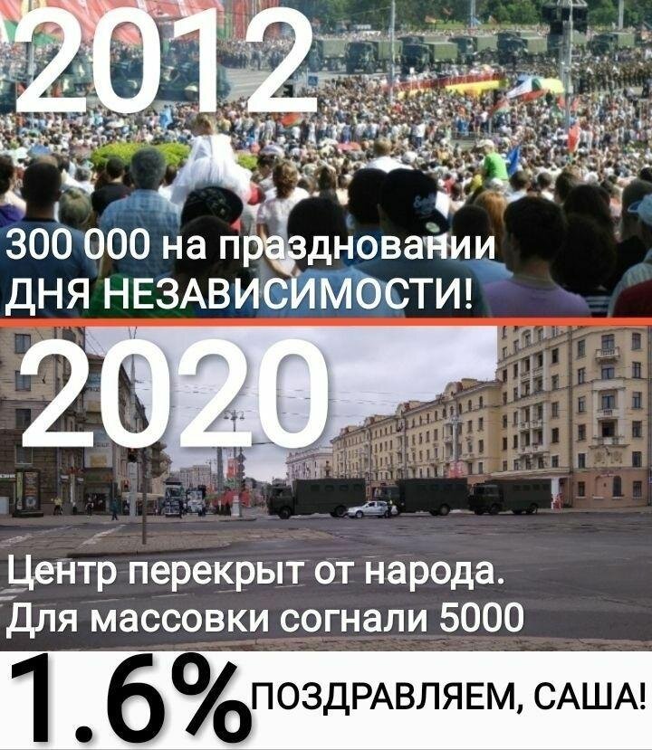 3 Июля в Беларуси отмечается день независимости Республики Беларусь.Из года в год это событие несло в себе атмосферу праздника и веселья.Люди спокойно выходили на улицы без намека на всякие протесты и акции,наблюдали за всем торжеством,которое проходило на улицах страны.Казалось бы в этом году все должно было пройти с таким же сценарием,но всю ситуацию пошатнул коронавирус и опасение властей по поводу протестов,которые могли прокатиться в этот день по всей Беларуси.Именно поэтому на самом празднике присутствовало около 5 тысяч человек.В сравнении с 2012 годом,когда было 300 тысяч человек,количество человек в этом году поражает своей численностью. Кроме этого было замечено множество автозаков,которые только в путь готовы забирать людей за нарушение порядка,которые вполне могли быть вероятны в виду последних событий насчет выборов в стране.Также на крышах минских зданий были замечены снайперы ,которые явно появились там не по своей воле,скорее всего это была охрана сверху для А.Г.Лукаше