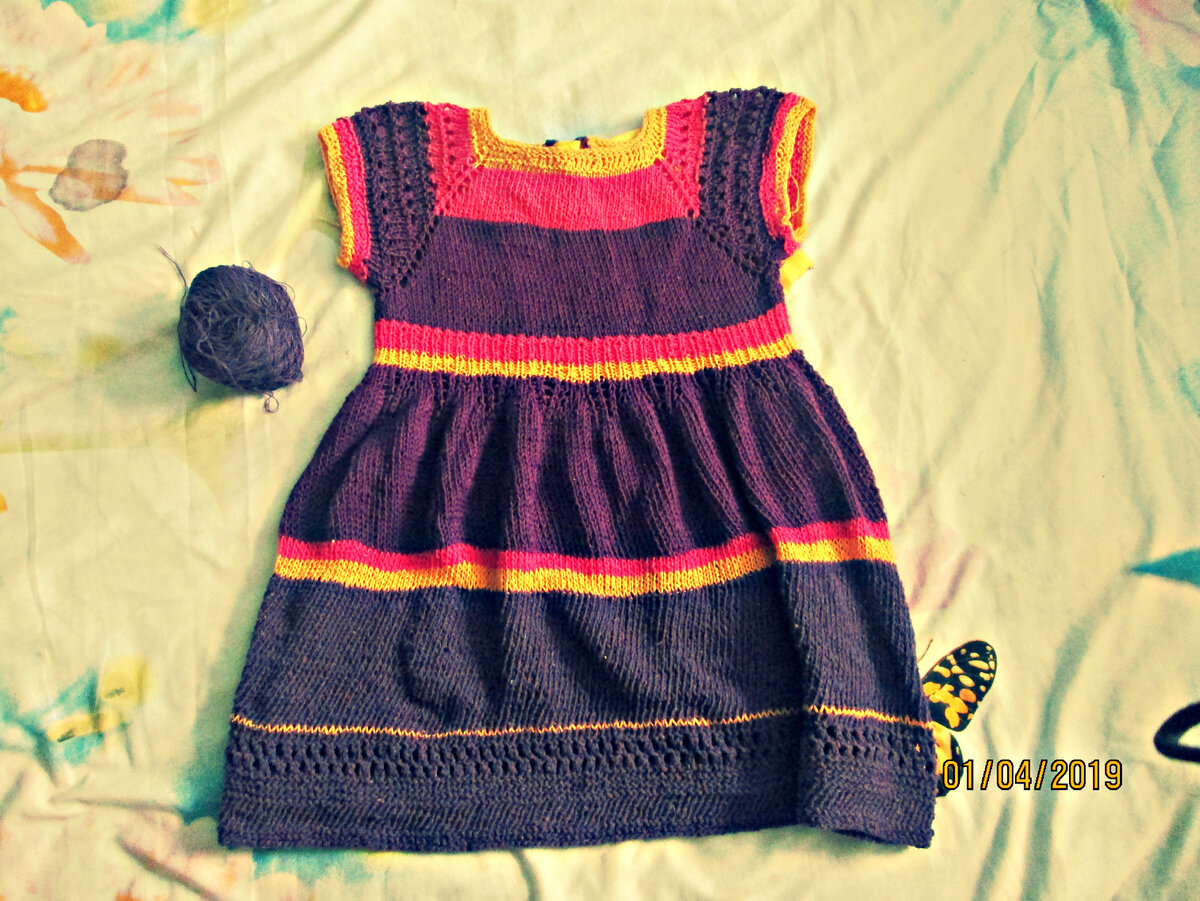 Еще одно платье я специально вязала старшей ходить дома после садика. Это я так приучала её переодеваться в домашнее а так как она категорический отказывалась потому что хотела носить нарядное, я и связала ей нарядное но домашнее и так она с радостью переодевалась! Изделие связано из Рассказовского хлопка и акрила! Белый и фиолетовый это хлопок а бирюзовый акрил! Кстати на этом платье я освоила технику интарсия и по кругу и поворотными рядами!