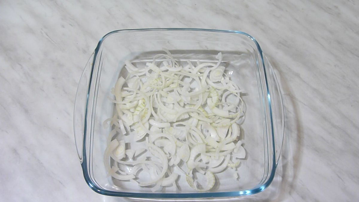 перец — по желанию Сегодня я буду готовить сазана с кабачками и другими овощами в духовке. Мне понадобятся: нарезанный полукольцами лук. Морковь можно потереть на крупной терке или нашинкованная соломкой. Кабачок я режу на кружочки.. Кабачок у меня молодой, поэтому я его не чистила и середину не удаляла. Зрелый кабачок стоит почистить, убрать мякоть с семечками и нарезать его кольцами, полукольцами, кубиками, либо произвольно. Кусочки сазана у меня уже были подготовлены и заморожены. Сазан — рыба достаточно крупная. Я обычно делю его на 2 части. Из одной готовлю сразу, а вторую замораживаю кусочками или по-другому — стейками. Сегодня я буду готовить из замороженной части. Полностью размораживать кусочки не стоит. Достаточно из морозилки переложить рыбу в холодильник, например, с вечера на ночь. И с утра, когда кусочки уже можно будет отделить друг от друга, начинать готовить. Дно формы я смазываю растительным маслом. Сначала выкладываю овощную подушку из лука и моркови. Её можно не
