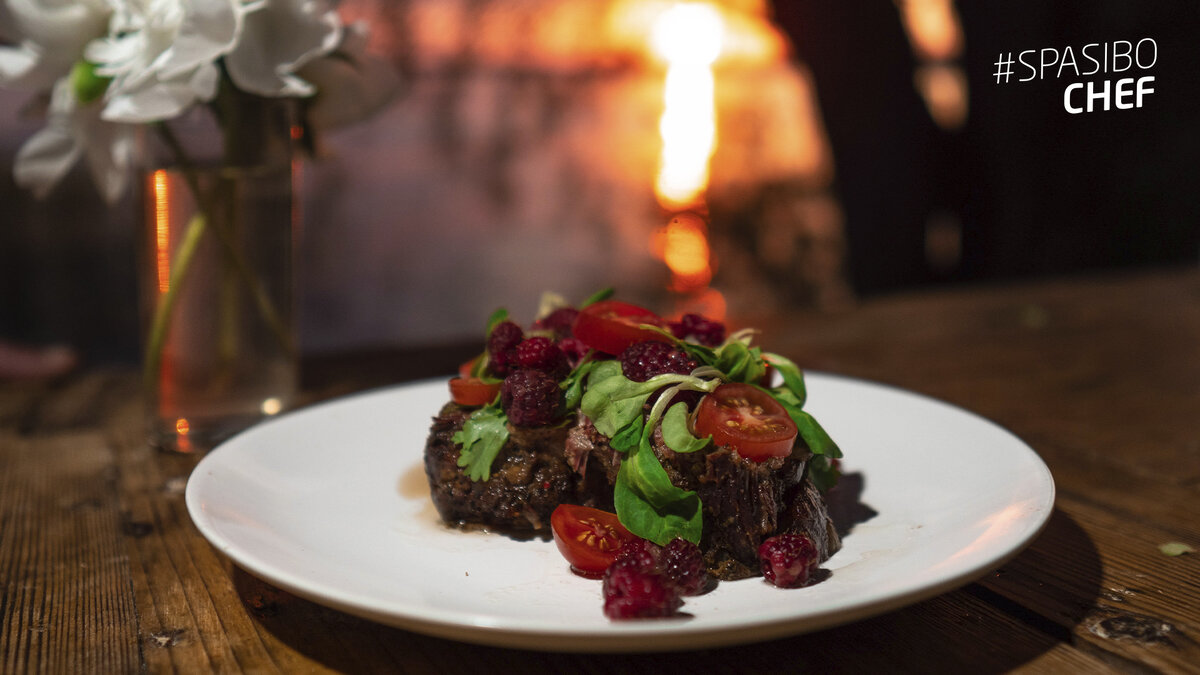 Простое, но в тоже время весьма изысканное блюдо. Сочная томленая говядина в сочетании с гарниром из остренькой моченой малины станет вкуснейшим украшением летнего вечера на природе.