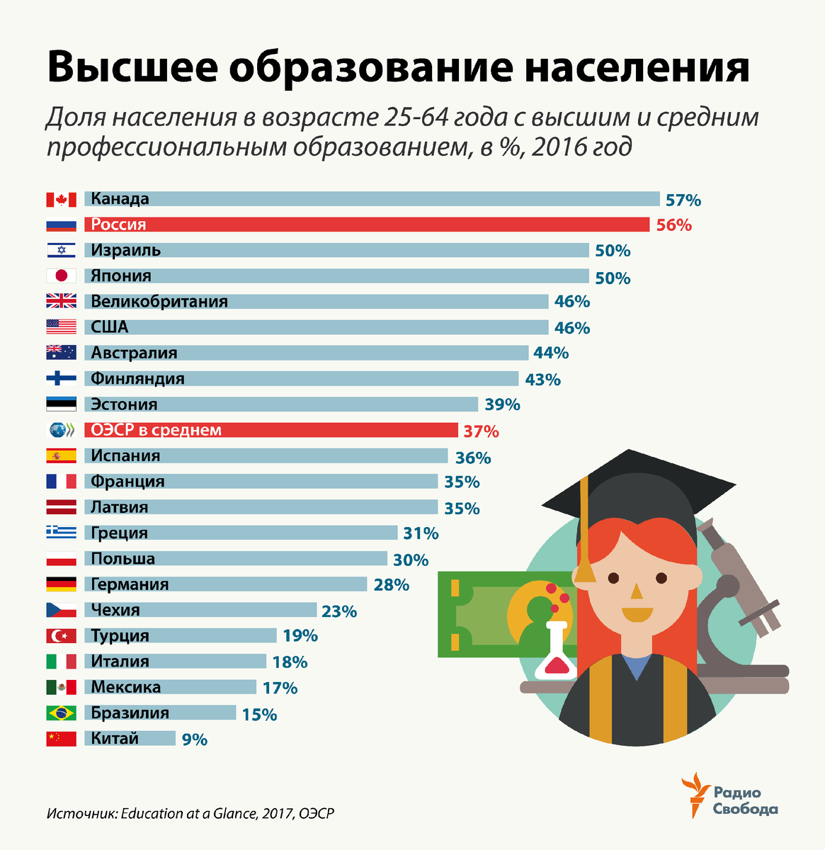 Сколько в России людей с высшим образованием? Насколько оно эффективно? И что надо делать? Поговорим! В нашей стране 56% населения имеют высшее образование. По этому показателю Россия является одним из лидеров. По идеи, этот фактор должен говорить о высоком интеллектуальном развитии граждан, о высоком уровне умений в каждой отдельной профессии. Однако на своем примере могу сказать - то далеко не так. Уровень высшего образования находится на катастрофически низком уровне. Поэтому многие люди после университета не могут найти работу - диплом выдали, а знаний не дали. Только в нашей стране кассиры, охранники и грузчики имеют за пазухой оконченное высшее. Особенно мне не понятна причина, по которой технические ВУЗы выпускают гуманитарные кадры. Ведь никому не придет в голову готовить, допустим, строителей в Высшей Школе Экономике? Так почему в Российском Университете Транспорта готовят журналистов? Куда потом устроится этот журналист, если даже инженеры транспорта из РУТа выходят никакие