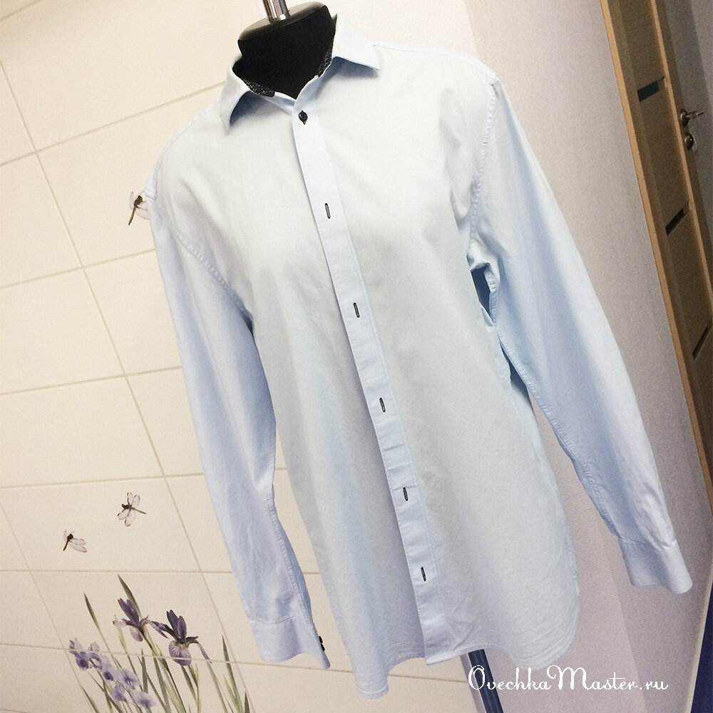 Рубашка интересная! Светло-голубая с черной отделкой.
