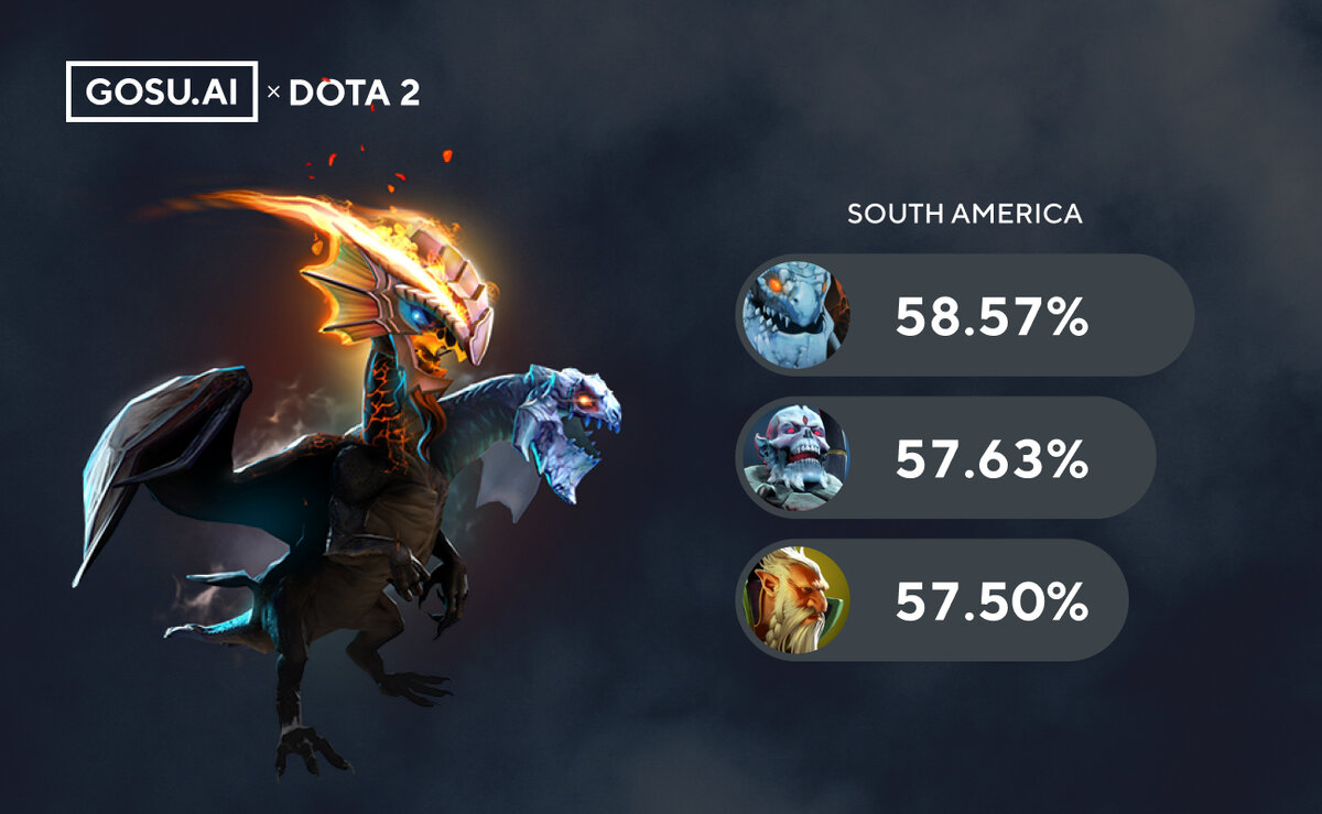 Здравствуйте, дорогие ГОСУ игроки! Сегодня мы хотим взглянуть на самых успешных саппортов в среднем бракете, и конечно же, смотреть мы будем исключительно на патч 7.27. Мы надеемся, что эта инфографика поможет вам чуть лучше понять текущую мету. Напоминаем, что ранее мы делали подобную инфографику для саппортов с низких рангов. Думаем, вам будет интересно сравнить результаты. Джакиро вновь доказал, что он является одним из самых эффективных саппортов. Достаточно неожиданно, первую строчку он занял лишь в Южной Америке, в регионе, в котором даже не попал в топ-3 на низких рангах. Сильные доминаторы на линии, такие как Bane и Ogre Magi оказались сильнейшими в двух самых соревновательных регионах - Китае и Европе. Почему же Джакиро, Бейн и Огр так сильны? Ответ достаточно прост. Победа в нынешнем патче сильно зависит от победы на линии. Чем сильнее ваш саппорт - тем проще одержать победу. Какие еще саппорты достаточно сильно в нынешнем патче, но не попали в эту инфографику?