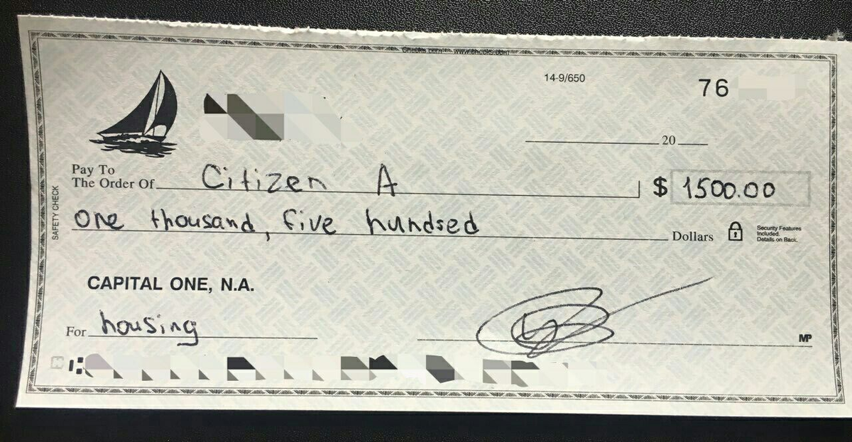 Все вы видели в фильмах как американцы выписывают друг другу чеки. Да, мы так делаем, достаточно часто. Заказываем чеки в своём банке и выписываем кому угодно на какую угодно сумму. На фото пример, как бы я выписал чек своему арендодателю.