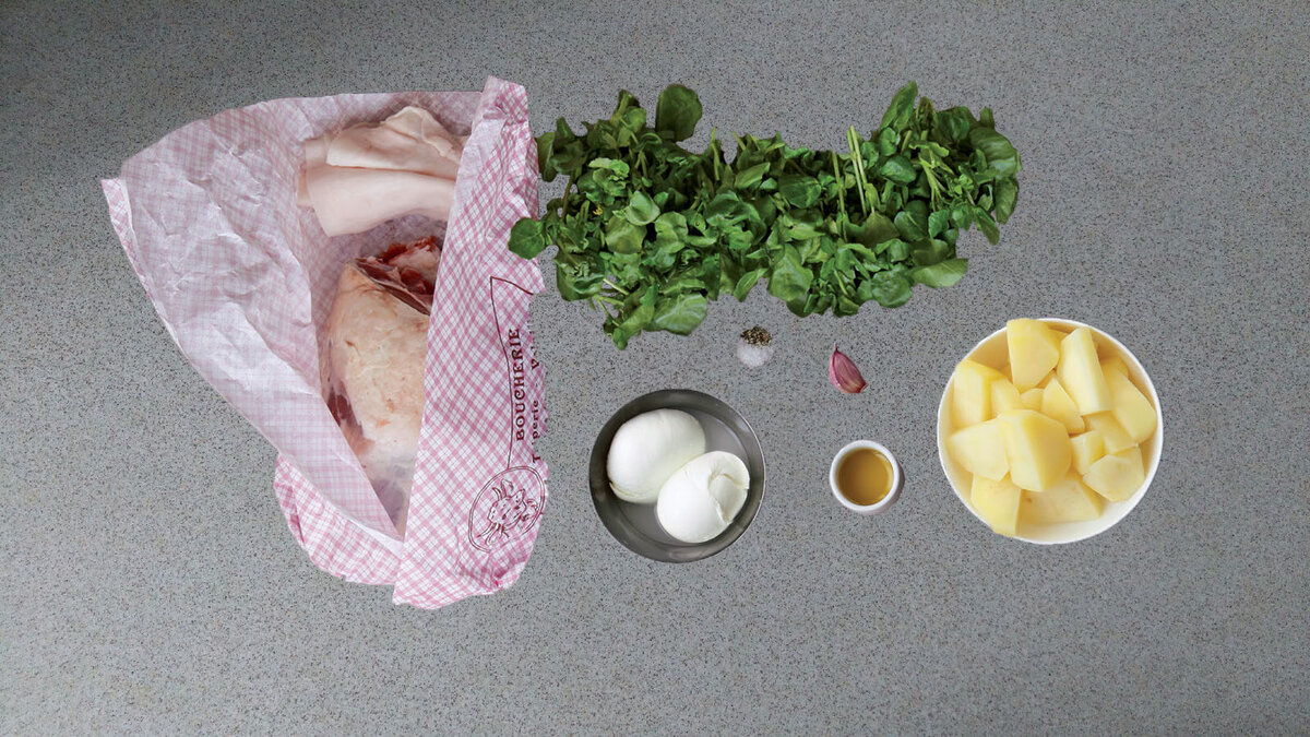 Овощи для гарнира. Я взял штук 6-8 картофелин. Заранее разогрейте духовку до 210 градусов. Так же почистите кресс-салат и обрежьте жёсткие стебли. Способ приготовления Шаг 1. Отложите четверть кресс-салата, а остальную часть измельчите в блендере. Также посолите и поперчите её. Если у вас получится так, что смесь станет чересчур густой, то добавьте немного рассола из моцареллы. Шаг 2. Разложите на куске сала лопатку. Также посолите, поперчите, натрите чесноком, брызните оливковым маслом, затем выложите сверху шарф из салата и сыра (отложите немного). Шаг 3. Заверните сало. Шаг 4. Обверните кулинарной нитью, словно жаркое. Шаг 5. Поместите в духовку на 30 минут. Мясо должно подрумяниться. По